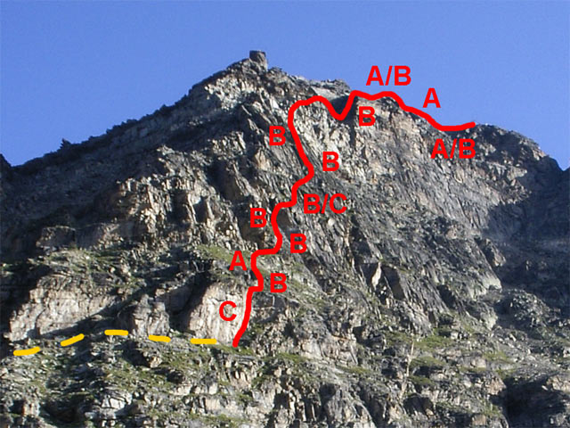 V půlce stěny cesta navazuje na žlutě značenou cestu Otto-Erich-Steig. Dále narazíte na malý žebřík, po kterém se dostanete na hřeben. Poté doleva, přes plotny, přes úsek s kramlemi a na závěr přes plotnu prostoupenou spárou k vrcholu.